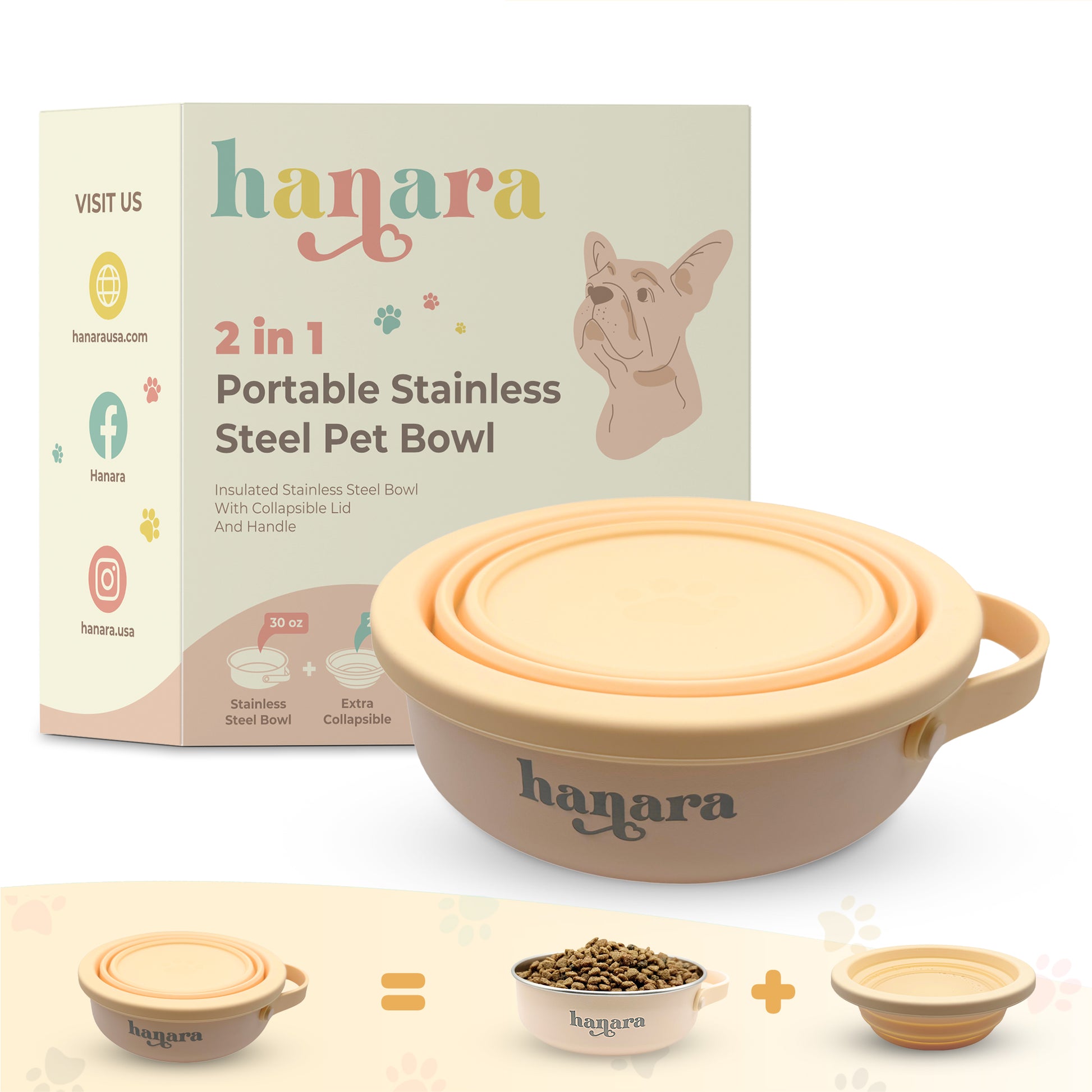2-in-1 Insulated Stainless Steel Dog Bowl with Extra Collapsible Lid and Handle for Dog Cat Pet | Non Slip Rubber Bottom | Portable, Great for Indoor, Outdoor| 30 OZ (Plus 20 oz) (Beige)